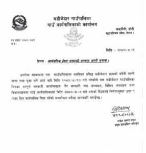 त्यस्तै उक्त मेला अवधिभर बडिकेदार गाउँपालिकाले मङ्सिर १० गते आफ्नाे स्थानीय तहमा सार्वजनिक बिदा दिने भएकाे छ । गाउँपालिकाले एक सुचना जारी गर्दै सधाझैँ प्रसिद्ध बडिकेदार धाममा लाग्ने मेलाको अवसरमा १० गते बिदा दिइएको जानकारी दिएकाे छ ।